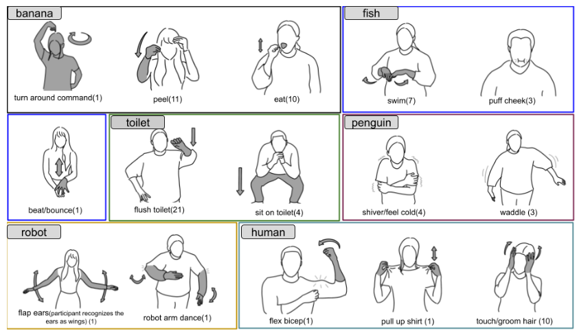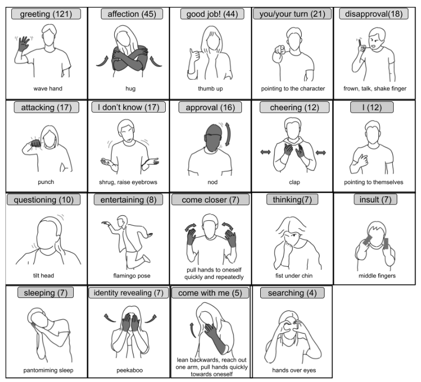 With minimal instructions, participants interacted freely with characters in various morphologies (banana, pufferfish, toilet, penguin, robot, human). We present a visual stimuli codebook of 137 unique non-verbal behavior actions used by humans to test the virtual characters.